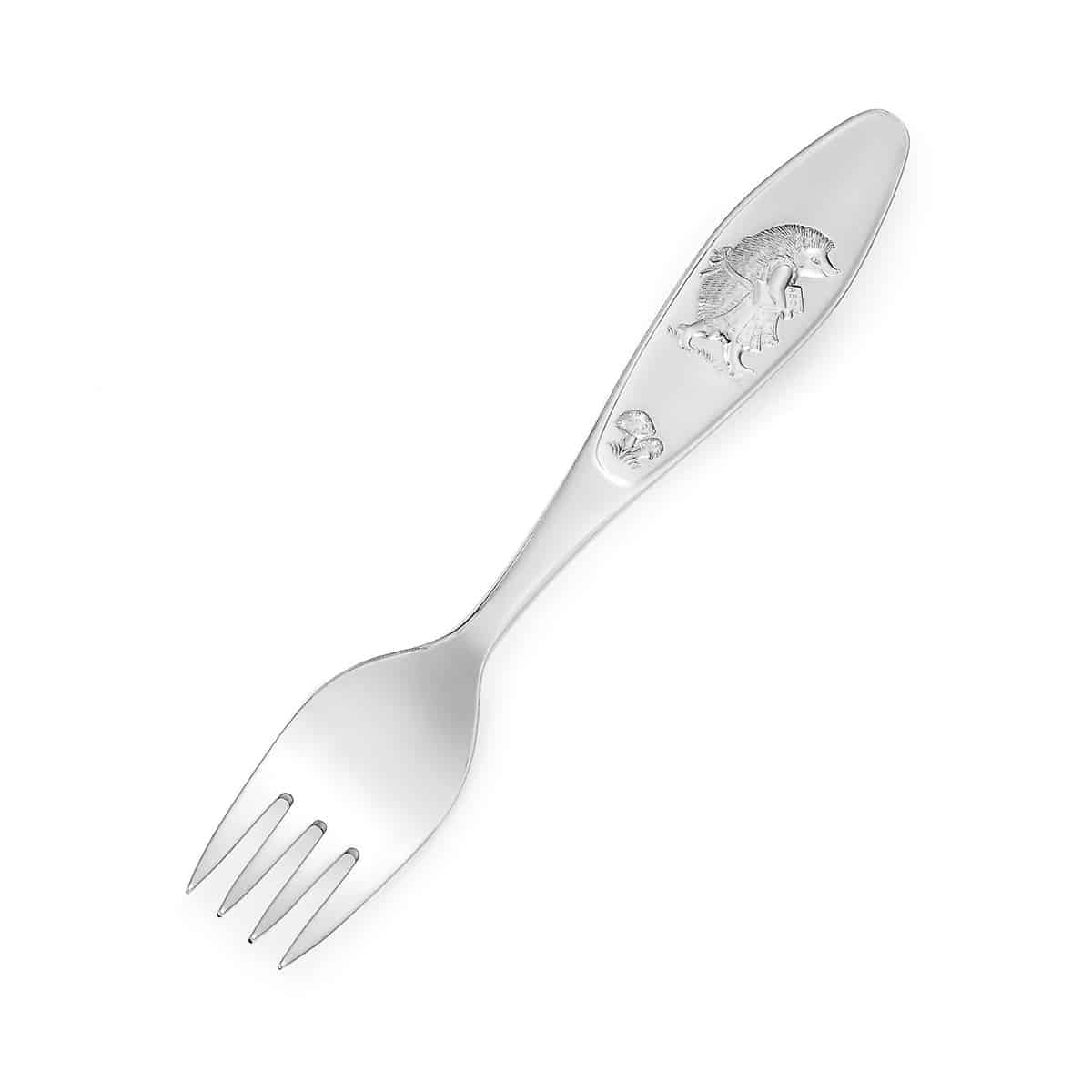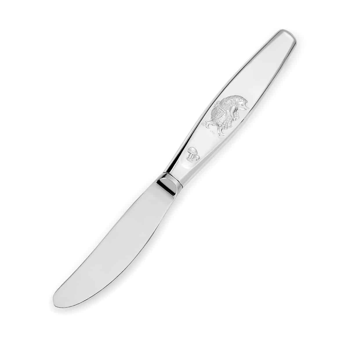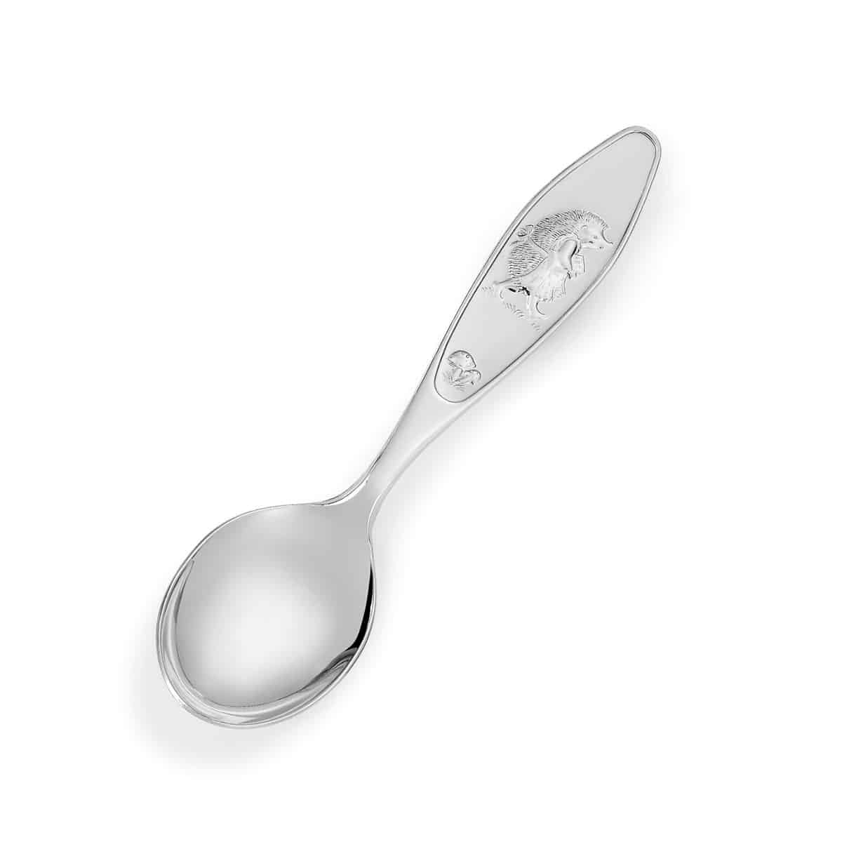 Gaveeske med skje, gaffel, kniv og babyskje i den fineste sølv, med koselig motiv inspirert av Alf Prøysens populære barnesang, Bolla Pinnsvin.