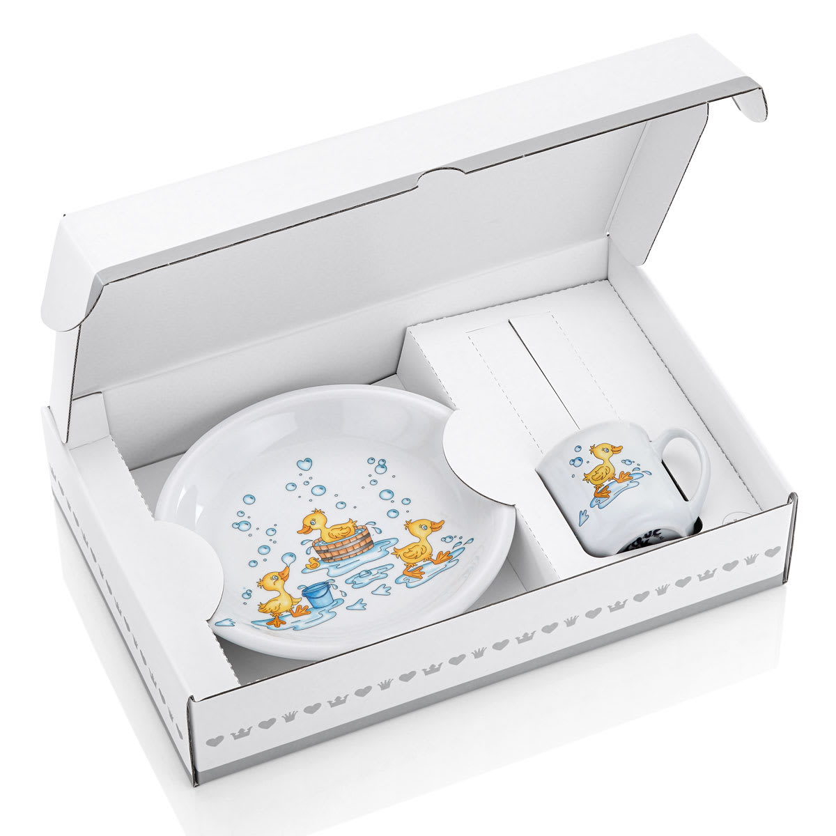 Porselenssett i to deler. Består av grøtskål og krus. Tåler oppvaskmaskin.