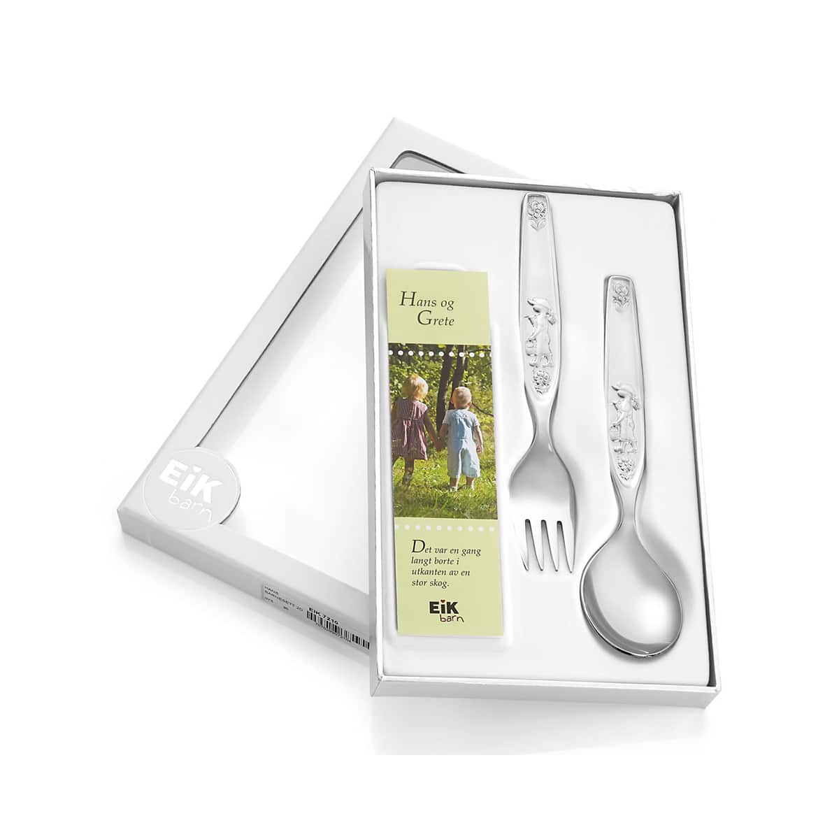 Skje og gaffel i sølvplett. Motiv av Hans, fra det velkjente eventyret om Hans og Grete. Kan graveres med navn og dato.