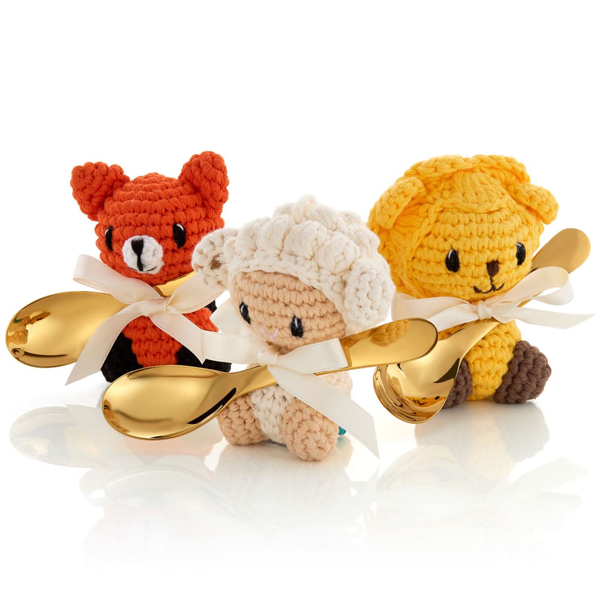 Sammen med den gylne stålskjeen får du en søt håndheklet løve fra BobiCraft. Lammet er CE-godkjent for barn i alle aldre, og tåler vask. Skjeen tåler oppvaskmaskin. Leveres i gavepose. Skjeen tåler oppvaskmaskin og kan graveres.