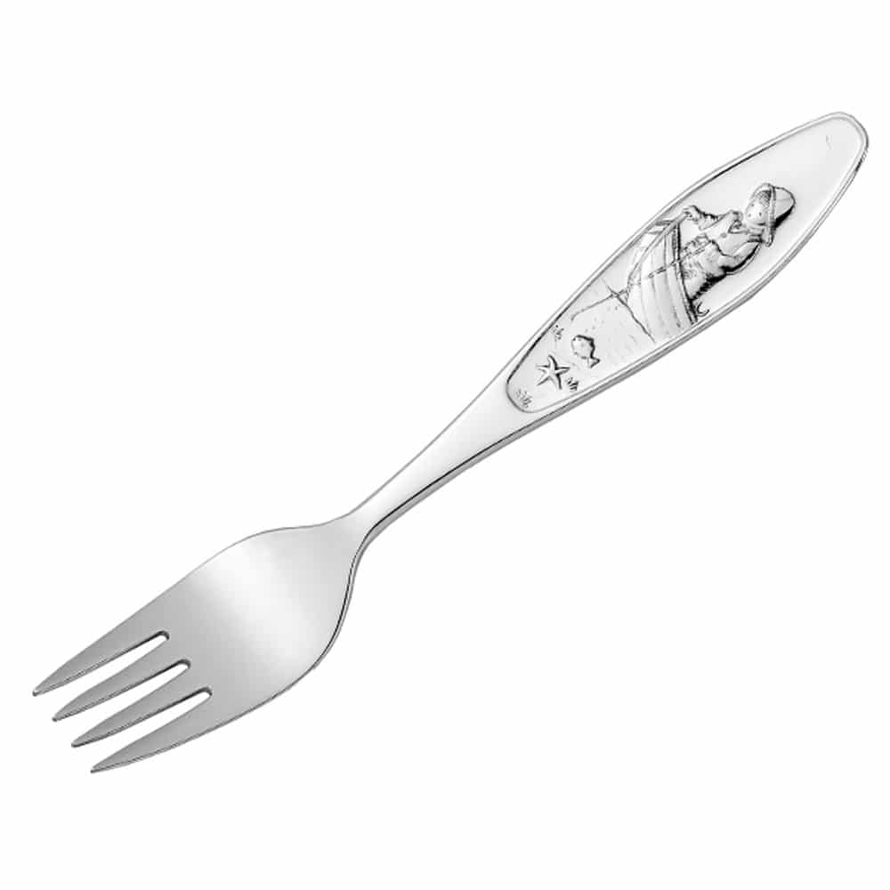 Barnegaffel i den fineste sølv, med motiv inspirert av den koselige barnesangen Ro, ro til fiskeskjær.