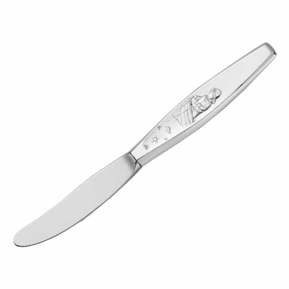 Barnekniv med skaft i den fineste sølv, med motiv inspirert av den koselige barnesangen Ro, ro til fiskeskjær.