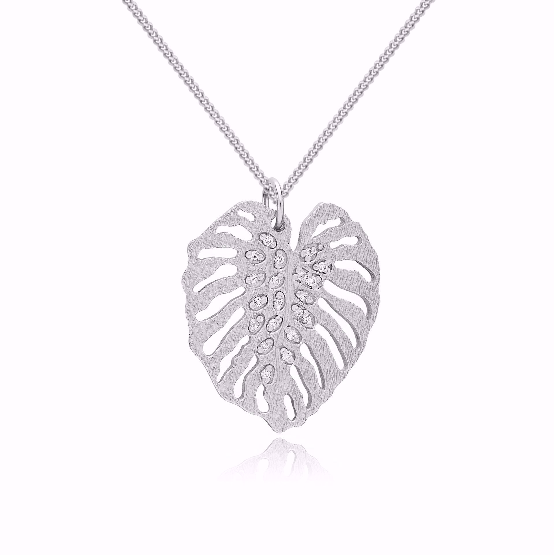 Vakkert smykke designet av Belinda Jakobsen i samarbeid med Goldstory. Anhenget er formet som et monstera-blad og er prydet med glitrende diamanter, som står i vakker kontrast til den lett børstede overflaten. Smykket er unikt og iøynefallende – perfekt for deg som er på jakt etter et eksklusivt smykke litt utenom det vanlige. Smykket selges komplett med kjede i sølv. Lengde: 45 cm. Materialer: 585 hvitt gull og diamanter. Totalvekt av diamanter: 0,18 ct. Diamantkvalitet: WSI. Diamantslip: Brilliant.