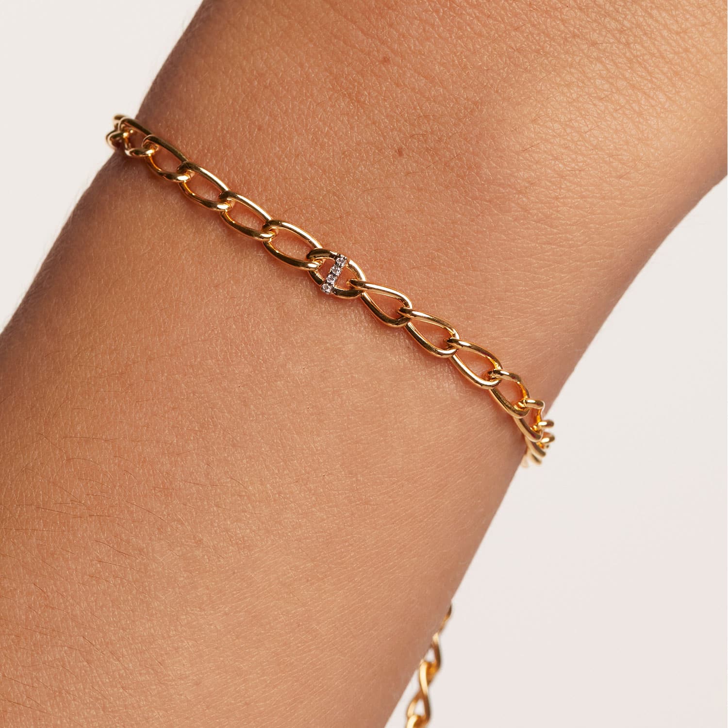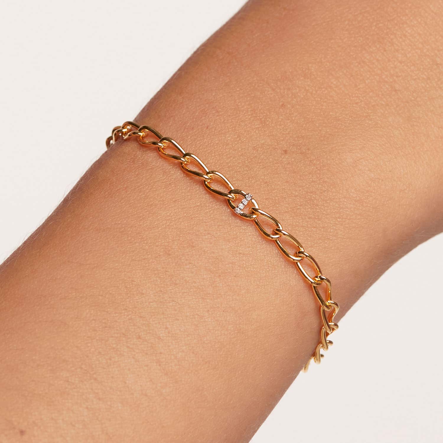 Laget av 18k gullbelagt sterlingsølv, ligger bokstavarmbåndets unike karakter i deres detaljerte håndverk: zirkonia av førsteklasses kvalitet satt i rhodiumbelagte utstikkere for et utseende med ensartet glans.