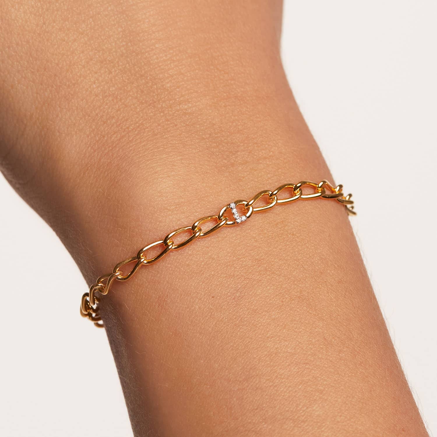Laget av 18k gullbelagt sterlingsølv, ligger bokstavarmbåndets unike karakter i deres detaljerte håndverk: zirkonia av førsteklasses kvalitet satt i rhodiumbelagte utstikkere for et utseende med ensartet glans.