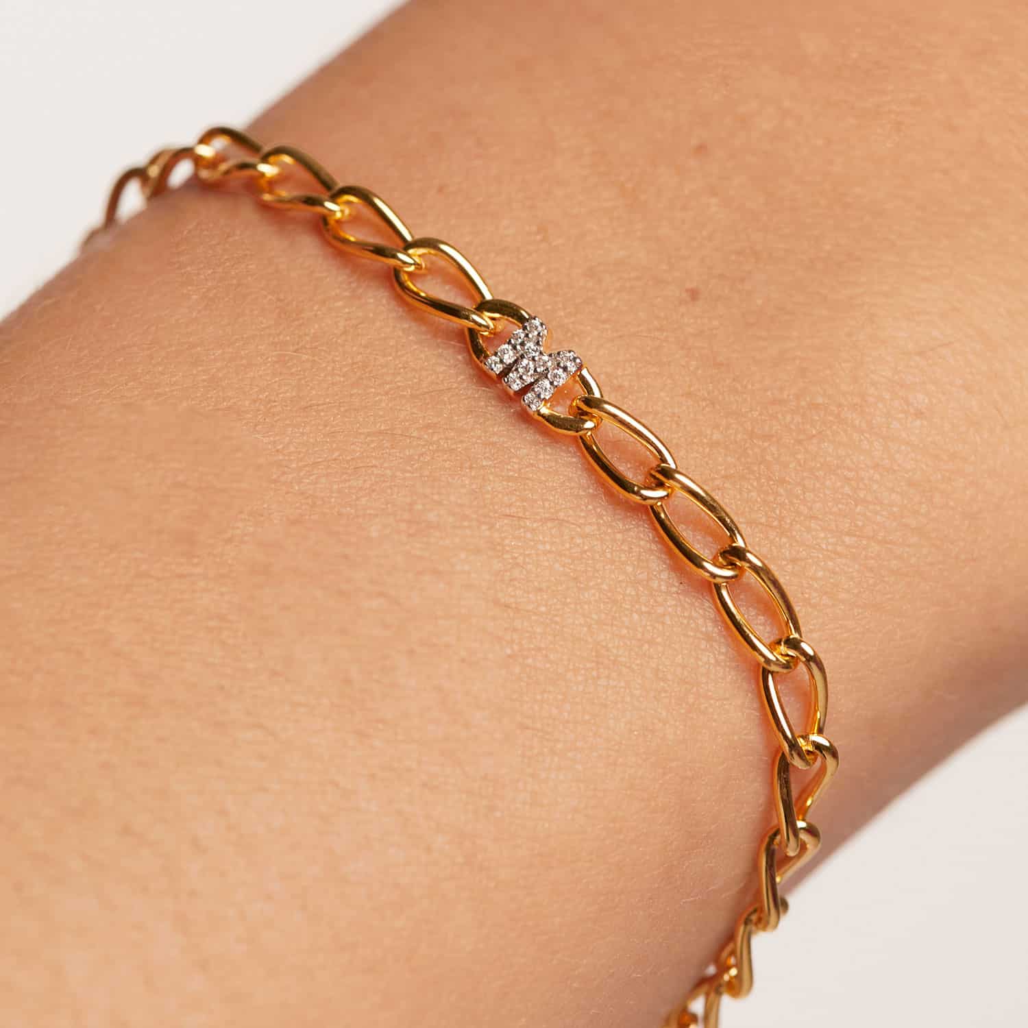 Laget av 18k gullbelagt sterlingsølv, ligger bokstavarmbåndets unike karakter i deres detaljerte håndverk: zirkonia av førsteklasses kvalitet satt i rhodiumbelagte utstikkere for et utseende med ensartet glans.