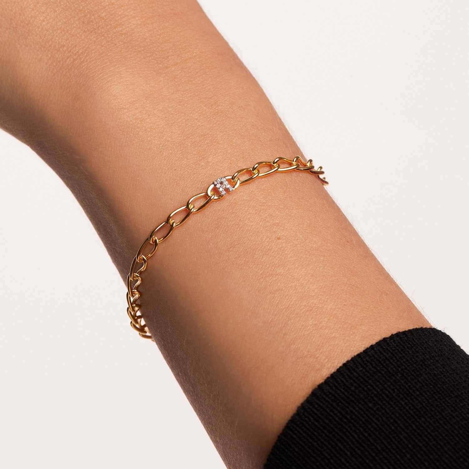 Laget av 18k gullbelagt sterlingsølv, ligger bokstavarmbåndets unike karakter i deres detaljerte håndverk: zirkonia av førsteklasses kvalitet satt i rhodiumbelagte utstikkere for et utseende med ensartet glans.