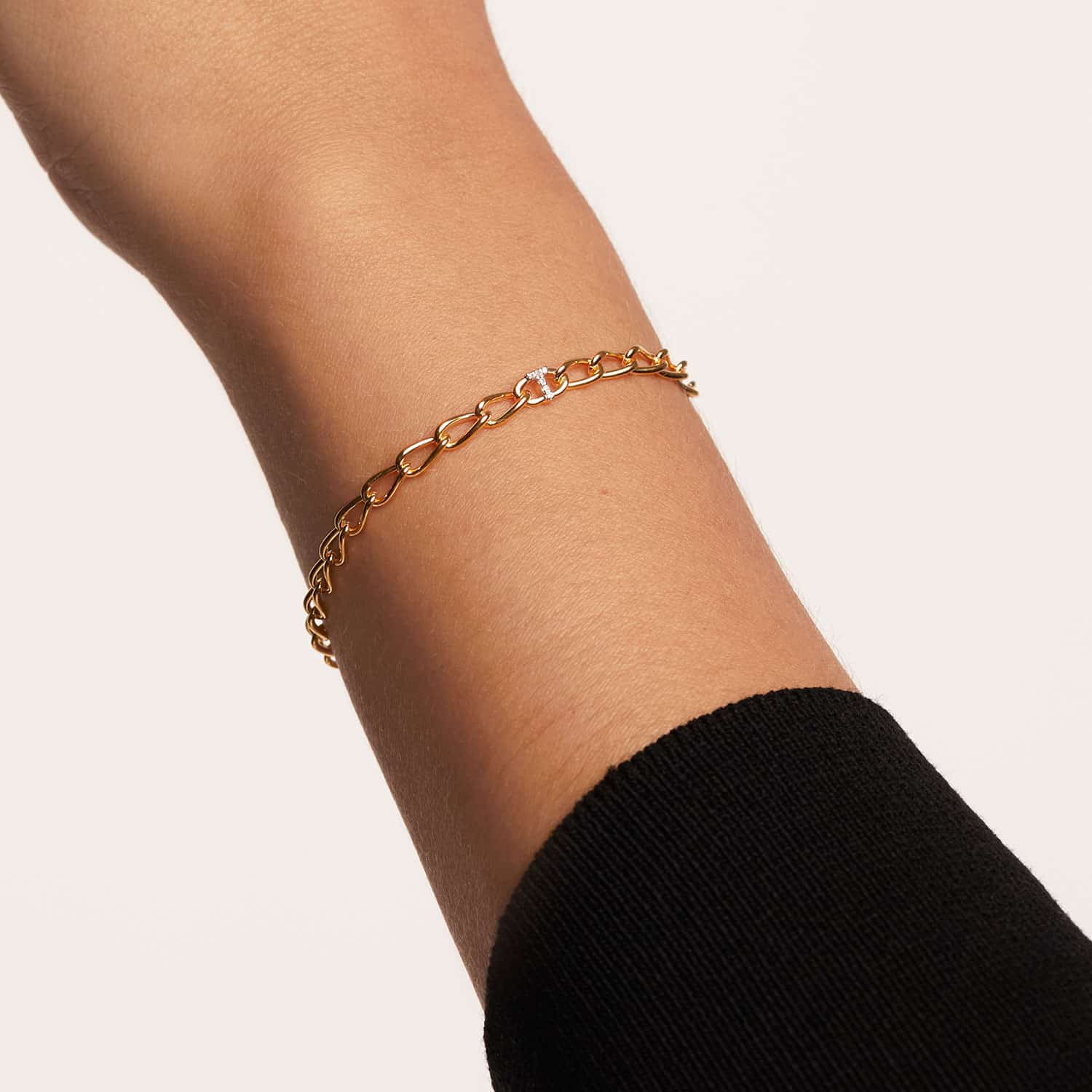 Laget av 18k gullbelagt sterlingsølv, ligger bokstavarmbåndets unike karakter i deres detaljerte håndverk: zirkonia av førsteklasses kvalitet satt i rhodiumbelagte utstikkere for et utseende med ensartet glans.