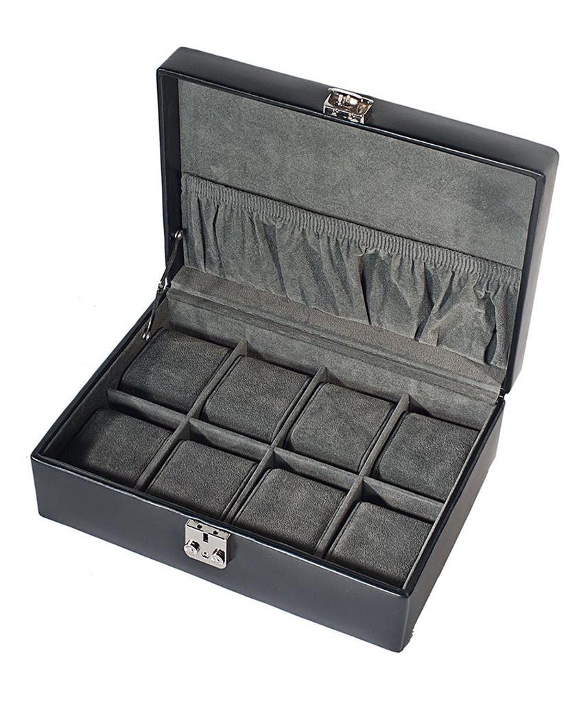 Elegant skrin med sort overflate for oppbevaring av 8 ur.