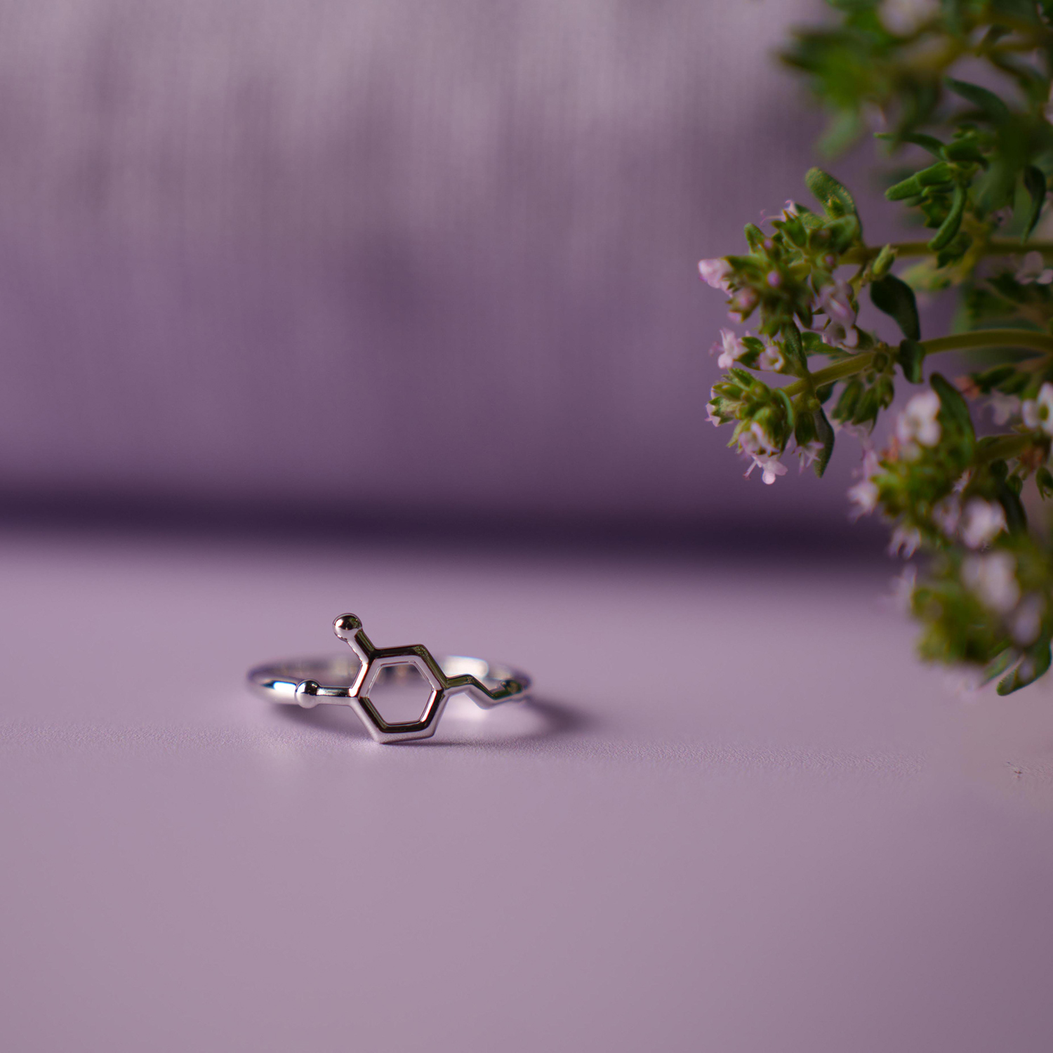 Denne ringen bærer molekylet dopamin – stoffet som gir oss motivasjon, glede og retning. Jeg har laget den som en påminnelse om å følge det som gir deg energi, lys og mening, og om å finne gleden i både det store og det helt hverdagslige. Dopamin minner meg på at livet blir rikere når vi lytter innover – når vi tør å velge det som gjør oss glade, i stedet for det vi bare føler at vi burde gjøre.