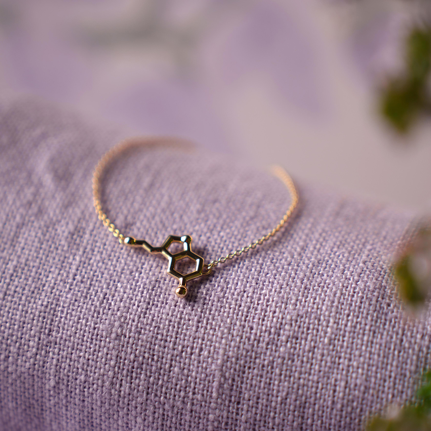 Dette armbåndet bærer molekylet serotonin – stoffet kroppen vår produserer når vi føler oss trygge, balanserte og til stede. For meg er det et symbol på indre ro, velvære og tillit til meg selv. Armbåndet er en liten, men viktig påminnelse: om å finne fred i øyeblikket, om å velge det som gjør deg godt, og om at du ikke trenger å løpe raskere – du trenger bare å lande i deg selv.