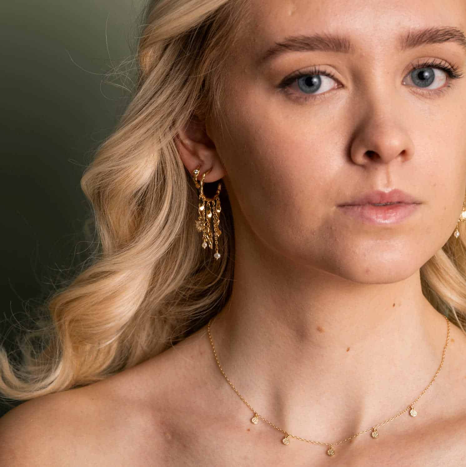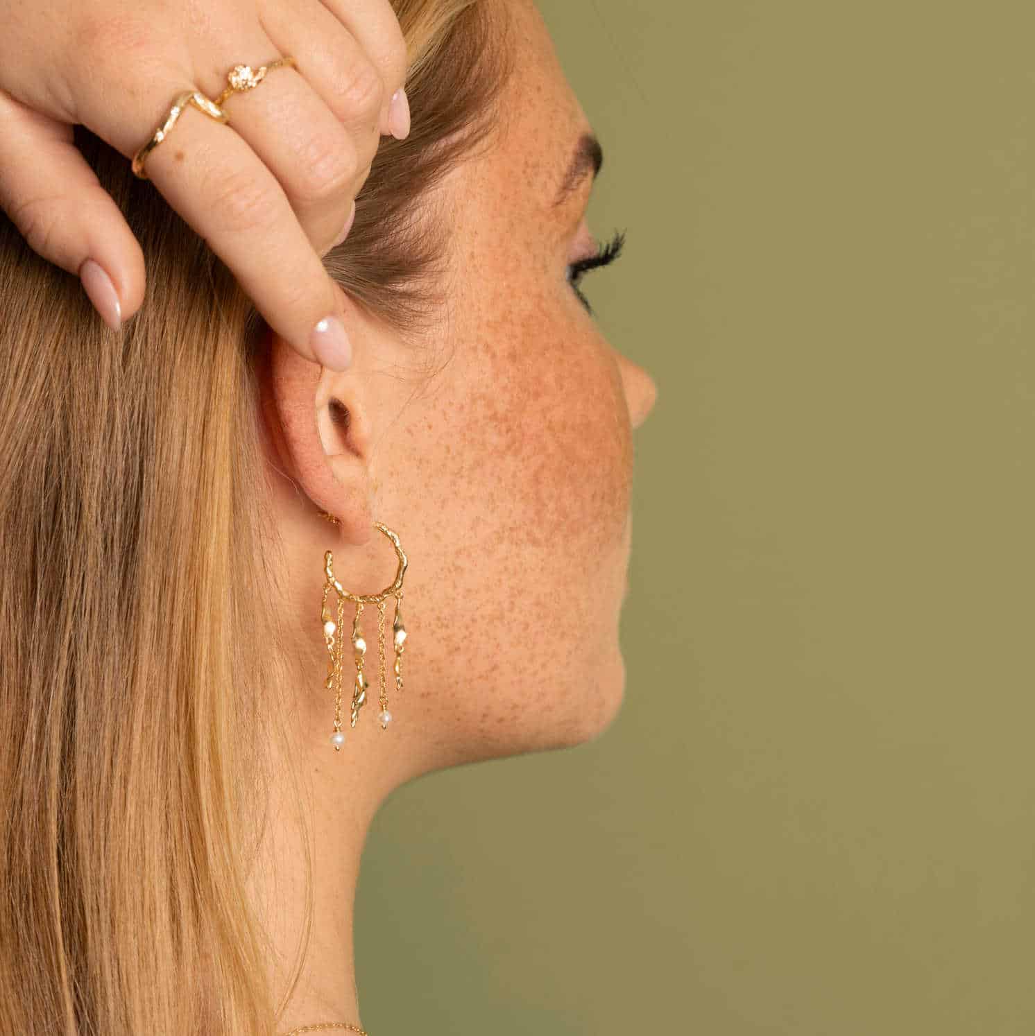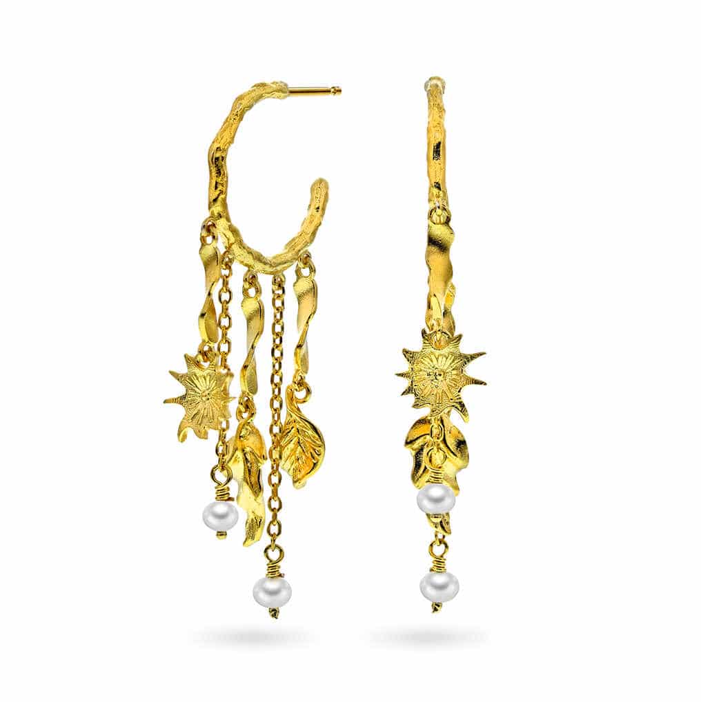 Trendy statementøredobber i hamret effekt med anheng i flere lag og dekorert med keshi perler.