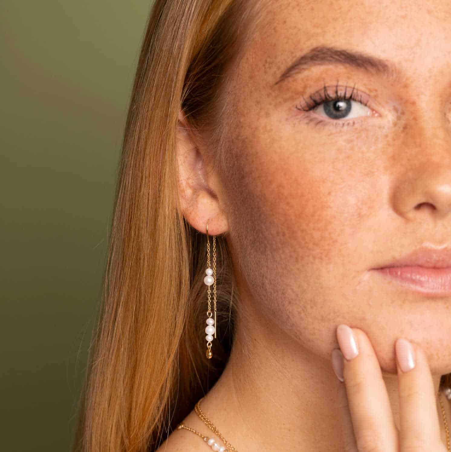 Nydelige øredobber med ferskvannsperler. Lang modell med kjede både foran og bak, og detaljer med hamret effekt. Finnes i matchende smykke og armbånd, og med fargekrystaller.