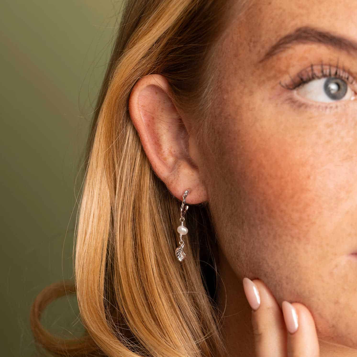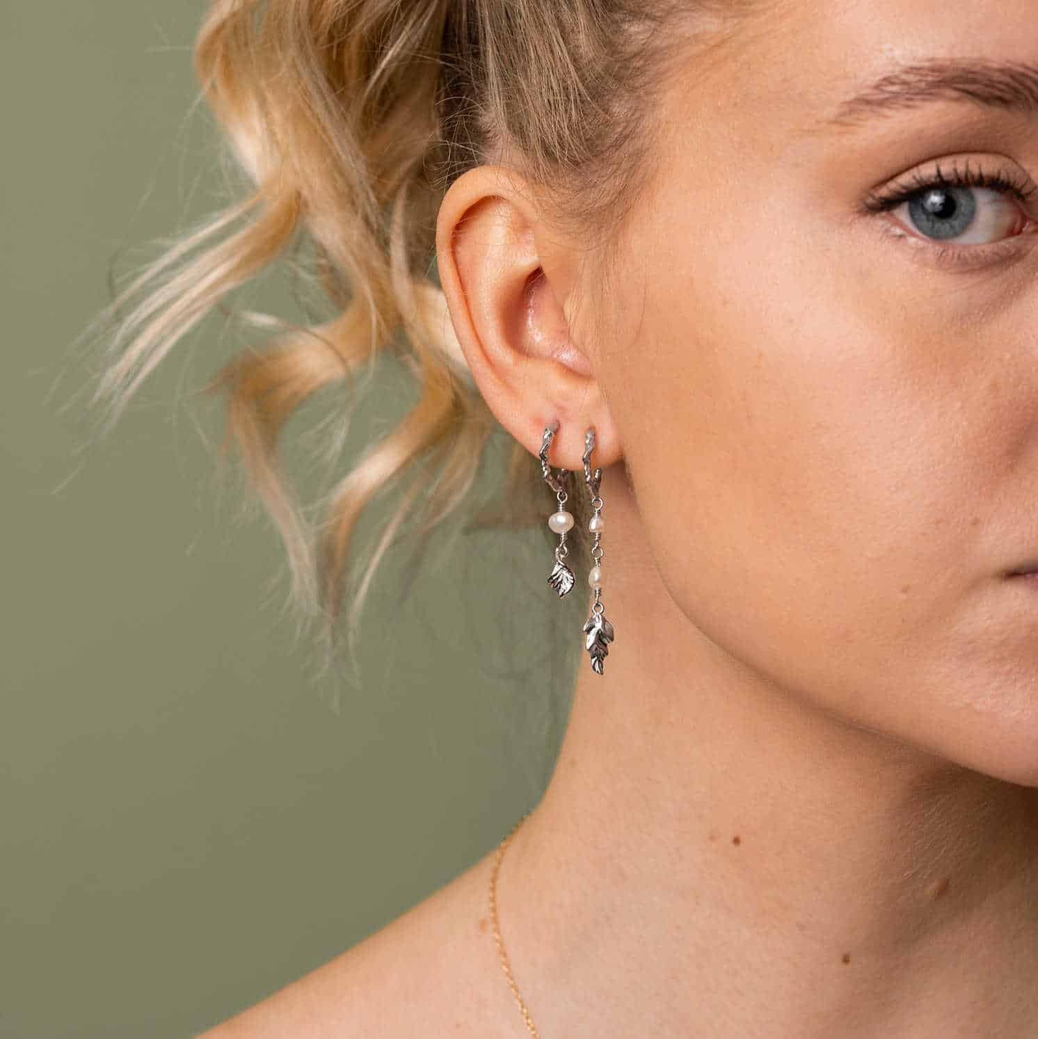 Trendy øredobber med strukturert effekt, vakre keshi barokkperler og bladformet anheng. Finnes også i forgylt. Sesongens musthave!