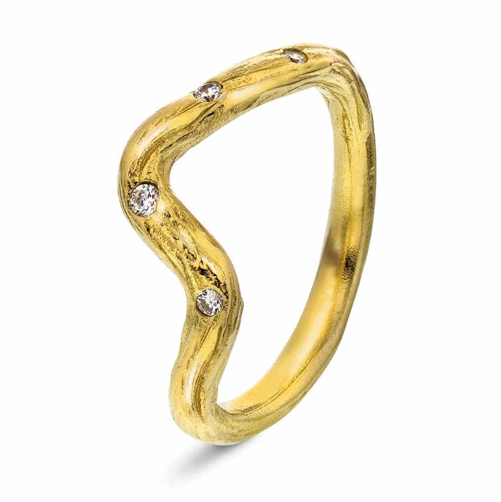 Trendy ring i bølget fasong med strukturert overflate og zirkoniastener. Buet innside gjør den behagelig å bruke.